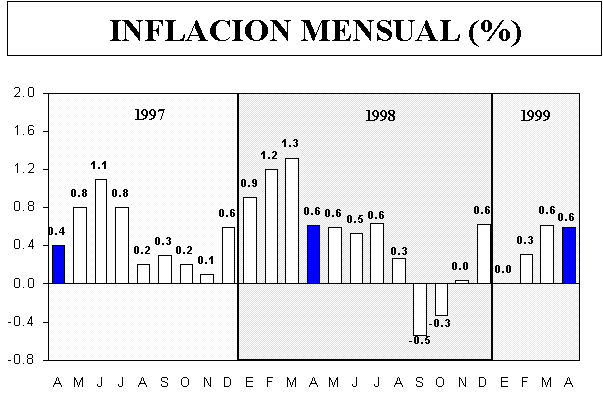 Asimismo, la tasa de crecimiento promedio mensual del Indice Inflacionario durante el primer cuatrimestre es de 0,38%. La tasa promedio mensual en el primer cuatrimestre de 1996 fue de 1,26%, en 1997 alcanzó a 0,56% y en 1998 esta tasa promedio mensual fue de 1,02%.