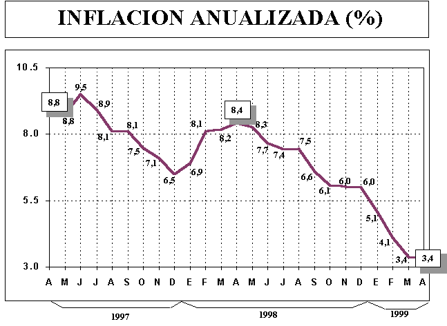 A partir de febrero de 1998 la inflación anualizada ha presentado un ritmo decreciente. Entre los meses de febrero a mayo de 1998 la inflación anualizada, registró tasas inflacionarias por encima del 8,0%, como consecuencia del Fenómeno de El Niño. En los meses de junio, julio y agosto, del año pasado, la inflación anualizada se ubicó alrededor del 7%. En setiembre, octubre, noviembre y diciembre estuvo próxima al 6,0%. En enero del presente año, la inflación anualizada fue de 5,07%, en febrero disminuyó al 4,11%. En los meses de marzo en que baja a 3,39% y abril que es de 3,37%, la inflación anualizada se ubica en el nivel del 3,0%.
