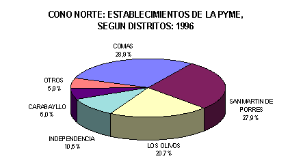 Los resultados de la actualización de negocios de 1996, nos indican que en el cono Norte estos se han incrementado en 142% con relación a 1993, a pesar de ello, la participación porcentual de los distritos sigue siendo casi la misma, a excepción de Los Olivos que muestra en 1996 una participación que es casi el doble con respecto a 1993 Asimismo se observa que estos establecimientos se concentran en algunos distritos debido a la mayor población que estos mantienen, al respecto, por cada 1,000 habitantes existen 19 establecimientos en 1996. Según el orden de importancia, se ha observado que en Comas funcionan 8,809 establecimientos, esto es el (28,9%), seguido de San Martín de Porres con 8,503 (27,9%) y Los Olivos con 6,304 (20,7%), Mientras que entre los distritos que registraron un menor número de establecimientos se encontraba Ancón con 296 (1,0%) y Santa Rosa con 85 (0,3%).