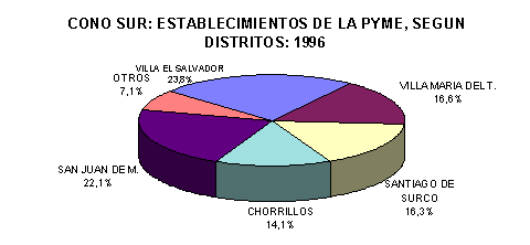 Por otro lado los resultados de la actualización de negocios de 1996, nos muestra que la participación porcentual de los distritos sigue siendo casi la misma en relación a 1993. Así, se puede apreciar que estos establecimientos se concentran en unos cuantos distritos debido a la mayor población que estos mantienen . Según el orden de importancia tenemos a: Villa el Salvador con 5,927 (23,8%), seguido de San Juan de Miraflores con 5,484 (22,1%), Villa María del Triunfo con 4,125 (16,6%), Santiago de Surco con 4,059 (16,3%). Mientras entre los distritos que tienen menor numero de establecimientos son Punta Negra con 122 y San Bartolo con 132 representando sólo el 0,5% cada uno respectivamente.