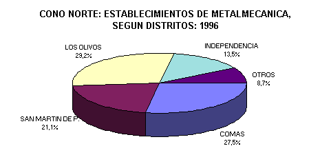 Los distritos más importantes que en 1996 concentraron el mayor número de establecimientos en Metal Mecánica son: Los Olivos con el 29,2%, seguido de Comas con el 27,5%, San Martín de Porres con el 21,1% e Independencia con el 13,5%, en conjunto dichos distritos representan el 91,3% del total de establecimientos. Cabe señalar que esta actividad logró entre los años 1993 y 1996 un incremento significativo (181%). Al respecto, el distrito de Los Olivos fue el que mas creció.