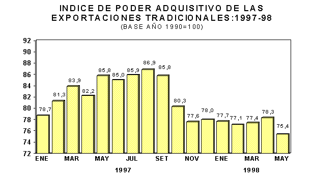 Nota: Indice de precios unitarios de exportación para el hierro, petróleo y algodón y de cotizaciones internacionales para el resto de productos |