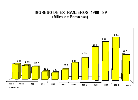 Nota: Para 1995 y 1996 se estima en 25% el porcentaje de extranjeros llegados al país con salvoconducto, que pernoctan en el país por lo menos una noche. |