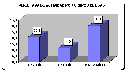 Según grupos de edad, la participación de los niños de 6 a 11 años en el mercado laboral es de 11,6%, es decir, de cada 100 niños de 6 a 11 años alrededor de 12 se encuentran en el mercado laboral trabajando o presionando por un puesto de trabajo, mientras que en el grupo de 12 a 17 años cerca de un tercio (30,3%) forman parte de la PEA, lo que significa que por cada 100 adolescentes, 30 de ellos están insertados en el mercado laboral ya sea como ocupado o desocupado.