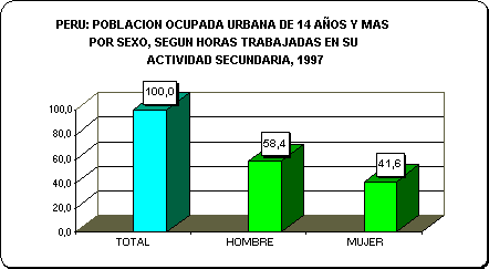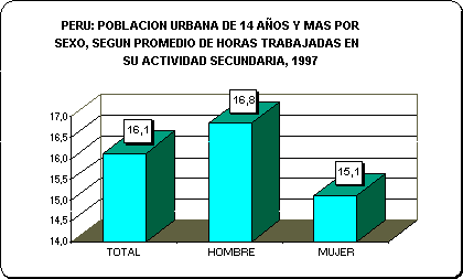 La PEA ocupada Urbana trabaja 16,1 horas semanales en promedio en su actividad secundaria, es decir, aproximadamente 3 horas diarias. Los hombres en promedio dedican 16,8 horas y las mujeres 15,1 horas semanales en su actividad secundaria.