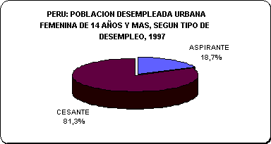 Según los resultados de la Encuesta Nacional de Hogares de 1997, del total de la población desempleada femenina, el 18,7% son aspirantes y el 81,3% restante son cesantes, es decir por cada 100 mujeres desempleadas alrededor de 19 buscan trabajo por primera vez y 81 buscan trabajo por haber perdido o concluido el que tenían.