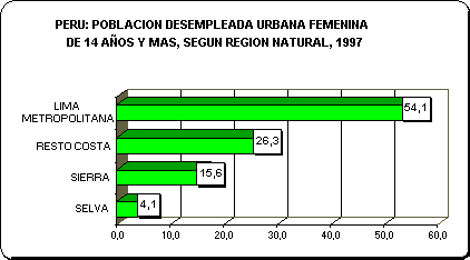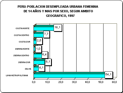 Lima Metropolitana concentra el 54,1% de desempleo femenino total, el resto se localiza en la Costa Norte y la Sierra Sur del país básicamente. Las Aspirantes sustantivamente se localiza en un 44,2% en Lima Metropolitana y un 20,0% en la Costa Norte del país.