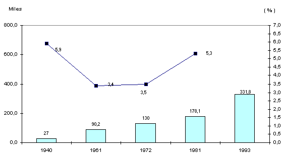En los dltimos 50 aZos se ha producido un importante incremento poblacional. La poblaci\n total del departamento en 1993, es un poco m<s de doce veces que la poblaci\n de 1940, 3,7 veces de la existente en 1961, 2,6 veces de la de 1972 y 1,9 veces que la poblaci\n total de 1981.