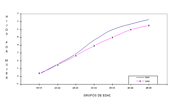 En el perRodo 1981 a 1993, el ndmero promedio de hijos por mujer casi se mantiene constante entre las mujeres de 15 a 24 aZos de edad. En cambio, a partir del grupo de 25 y 29 aZos se observa una disminuci\n, y con mayor intensidad entre los 30 y 49 aZos de edad, en donde la reducci\n es en promedio, alrededor de un hijo por mujer.