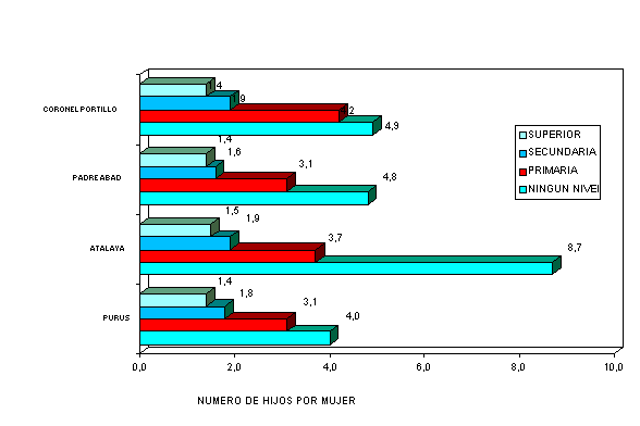 Las provincias de Atalaya y Coronel Portillo presentan los mayores promedios de hijos por mujer, en la categorRa ningdn nivel y primaria. En el nivel de educaci\n secundaria y en el grupo de mujeres con educaci\n superior, no existen diferencias significativas entre las provincias.