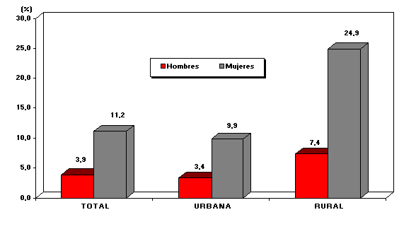 En el área urbana, la población de 15 a 19 años de edad registra una tasa de analfabetismo de sólo 1,7%. En el área rural el grupo de edad de 65 y más años, con 53,3% muestra la tasa de analfabetismo más alta.
