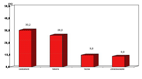 A nivel provincial, se puede observar que la tasa de analfabetismo de las provincias de Candarave y Tarata están por encima del promedio departamental (20,0% y 15,2% respectivamente). En cambio, la provincia de Jorge Basadre presenta la tasa más baja del departamento (5,2%).