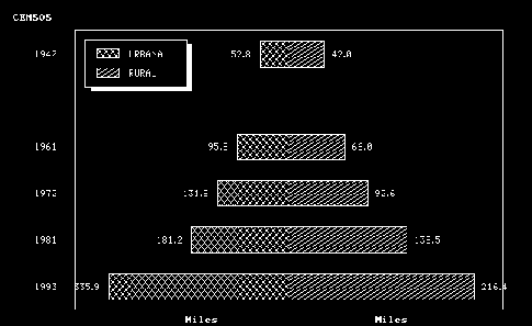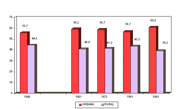 En cifras absolutas la población del área urbana continúa aumentando, paralelamente, su velocidad de crecimiento viene incrementandose desde mediados de la década del 40, incremento que se hace más intenso en los dos últimos períodos intercensales, 3,6% y 5,3%, respectivamente. La población del área rural, entre 1972-1981 crece a un ritmo superior al observado en el área urbana (4,5%), para luego en el período 1981-1993 disminuir a 3,8% promedio anual.