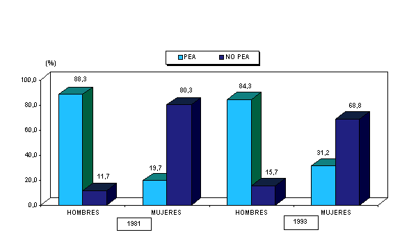 Por sexo, la población femenina disminuye su proporción dentro de la NO PEA, de 80,3% en 1981 a 68,8% en 1993, indicando una mayor participación de la mujer en las actividades económicas. La población masculina presenta un mayor incremento en su proporción dentro de la NO PEA. De 11,7% en 1981 a 15,7% en 1993.