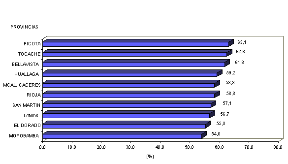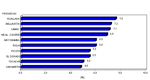 En términos generales, en la provincia de Huallaga, cerca de 8 de cada 100 niños trabajan, siendo una proporción mayor al promedio departamental, mientras que en San Martín sólo lo hacen cerca de 5 de cada 100 niños.