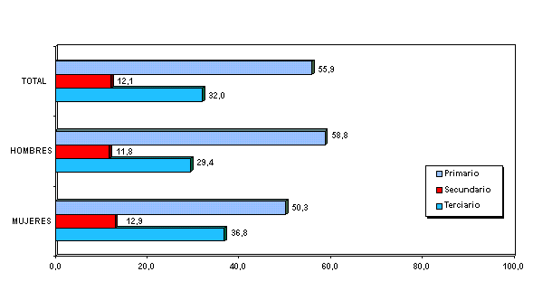 En 1993, del total de la PEA femenina ocupada, la mayor proporción (50,3%) se encuentra en las actividades primarias de la economía. La participación masculina en este sector es de 58,8%. En el Sector Terciario la PEA femenina con 36,8% de participación es mayor a la PEA masculina, que alcanza el 29,4% .