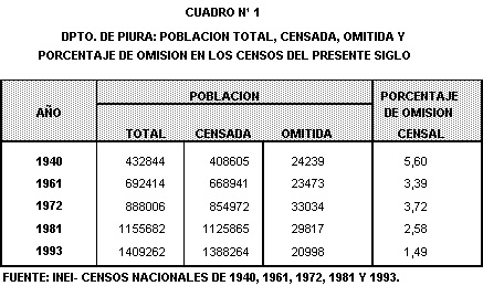 El coeficiente de omisi\n censal de 1,49% es el m<s bajo registrado en todos los censos efectuados en el departamento de Piura. En los censos de 1940, la tasa de omisi\n fue de 5,60%, en 1961 de 3,39%, en 1972 de 3,72% y en 1981 de 2,58%.