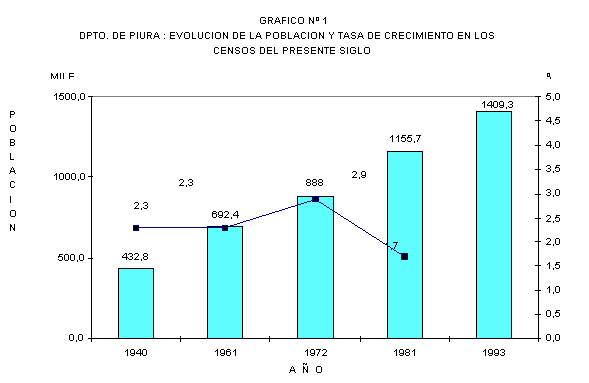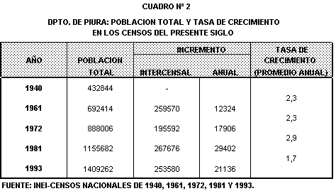 En el perRodo intercensal 1981-1993, la poblaci\n del departamento de Piura ha experimentado un crecimiento de 1,7% por aZo. Esta tasa de crecimiento es inferior a la registrada en el perRodo 1972-1981, que fue de 2,9% y tambiJn a la de los perRodos anteriores, 1961-1972 y 1940-1961 en los que se mantuvo el crecimiento en 2,3%.