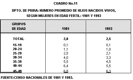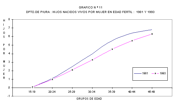 Considerando el total de hijos nacidos vivos de las mujeres en edad fJrtil (15 a 49 aZos), el ndmero promedio de hijos en el departamento de Piura es de 2,5, cifra menor a la observada en el Censo de 1981 que fue de 2,8 hijos por mujer. TambiJn se aprecia una disminuci\n del ndmero de hijos en todos los grupos de edad del perRodo fJrtil, aunque con diferente intensidad entre ellos. A excepci\n del grupo de 15 a 19 aZos donde se mantiene el ndmero promedio de hijos (0,1), la mayor reducci\n se presenta en el grupo de 35 a 39 aZos, que en 1981, el ndmero promedio de hijos fue de 5,5 y en 1993 de 4,5.