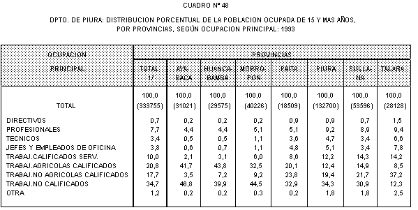 Similar comportamiento se observa a nivel de cada una de las provincias, tanto en Huancabamba como en Talara, hay una mayor proporci\n de trabajadores agrRcolas 51,0% y 45,7% respectivamente, en Paita el 43,9% tiene dicha ocupaci\n. Talara tiene la menor proporci\n de trabajadores no calificados (12,3%), a diferencia de Ayabaca, donde se ubica el mayor porcentaje (46,8%) de dicha categorRa.