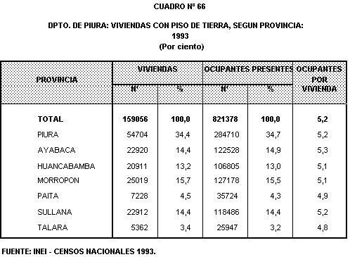 A nivel provincial, Piura presenta el mayor porcentaje de viviendas con piso de tierra. Es de destacar que en esta provincia, 3 de cada 10 viviendas tienen esta caracterRstica y albergan a 284,710 personas.