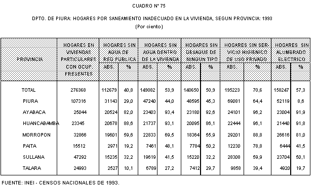 La ausencia de una adecuada infraestructura de servicios b<sicos en las viviendas advierten diferencias interprovinciales en los servicios b<sicos de los hogares. AsR, se observa una situaci\n crRtica de saneamiento y de infraestructura de las viviendas en las provincias de Ayabaca y Huancabamba. En estas provincias el 96,2% y 96,1% de hogares respectivamente no cuentan con servicios higiJnicos de uso privado, el 93,4% y 93,1% de hogares respectivamente no poseen instalaci\n de agua dentro de la vivienda. Al mismo tiempo el 91,9% y 91,8% de hogares respectivamente no tienen alumbrado pdblico.