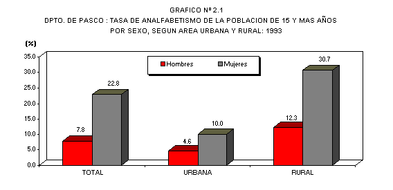 En la población de 15 y más años de edad, la tasa de analfabetismo es de 15,3%, menor a la de 1981 que fue de 22,3%, reduciéndose en 7,0 puntos porcentuales. En el área urbana la tasa de analfabetismo baja de 17,0% en 1981 a 11,4% en 1993. En el área rural la disminución es más significativa, pasando de 29,9% en 1981 a 21,0% en 1993.