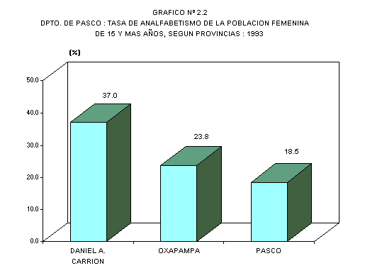 A nivel provincial, se puede observar que la tasa de analfabetismo de las provincias de Daniel Alcides Carrión y Oxapampa están por encima de la tasa promedio departamental (15,3%). En cambio, la provincia de Pasco presenta una tasa menor al promedio departamental (11,8%).
