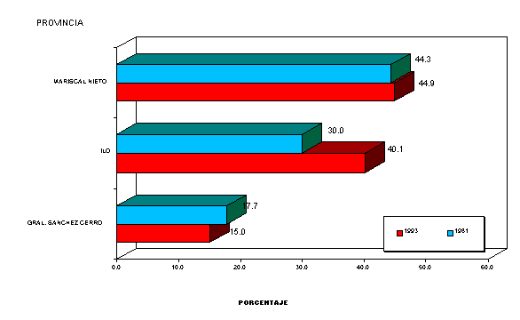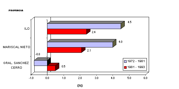 Las provincias de Ilo y Mariscal Nieto, disminuyen considerablemente su velocidad de crecimiento con respecto al perRodo intercensal 1972-1981, perRodo en el cual crecRan a tasas de 4,5% y 4,0%, respectivamente. Contrariamente la provincia de General S<nchez Cerro de tener una tasa de crecimiento negativa (-0,8%), en dicho perRodo; pasa a ser positiva entre 1981-1993 (0,5%).