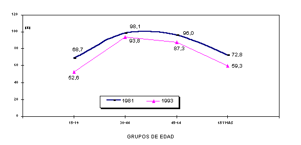 se reduce de 65,4% en 1981 a 61,6% en 1993 y en el grupo de 65