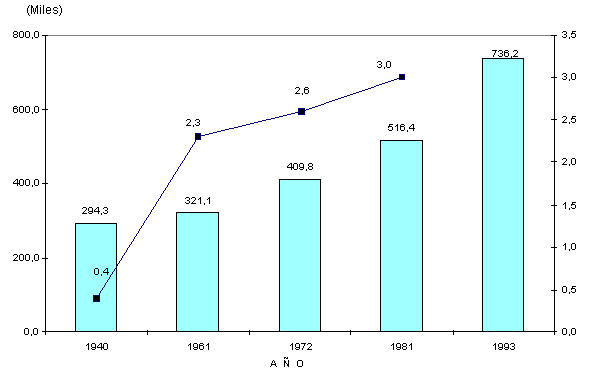 En los dltimos 50 aZos se ha producido un significativo incremento poblacional. La poblaci\n total del departamento en 1993, es m<s del doble (2,5 veces) que la de 1940, 2,3 veces de la existente en 1961, 1,8 veces que la de 1972 y 1,4 veces que la poblaci\n total de 1981.