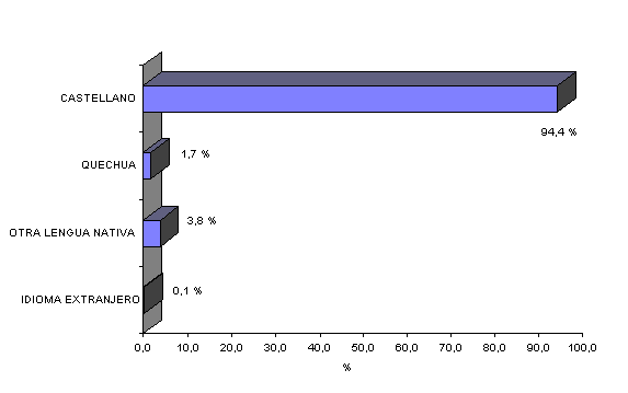 Segdn el censo de 1993, el 94,4% de la poblaci\n a nivel departamental, manifest\ haber aprendido el Castellano como lengua materna,mientras que una proporci\n minoritaria (3,8%) aprendi\ otra lengua nativa y s\lo el 1,7% aprendi\ quechua.
