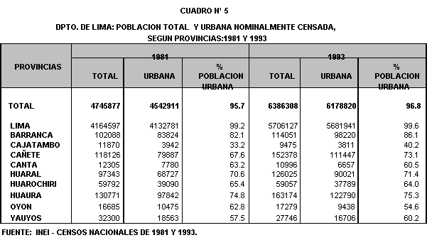 Analizando los porcentajes de población urbana respecto a su población provincial, Lima advierte la mayor proporción con 99,6%, la concentración de la población en esta provincia en la que se ubica la capital de la República, se explica por la importancia que ella tiene en el campo económico, social y Político-Administrativo, que la han convertido en el principal foco de atracción de migrantes del país. Las provincias de Barranca, Huaura, Cañete y Huaral concentran el 86,1%, 75,3%, 73,1% y el 71,4% respectivamente.