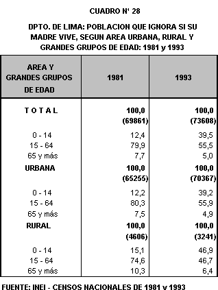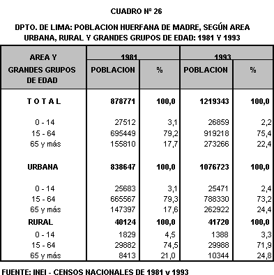 Por área urbana y rural, los resultados muestran que la mayoría de huérfanos se encuentran en el área urbana ( 1'177,623 personas que representan el 96,6% del total de huérfanos en 1993). Por grupos de edad en esta área se observa la disminución de la importancia porcentual de huérfanos menores de 15 años (de 3,1% en 1981 a 2,2% en 1993) apreciándose también una disminución en términos absolutos en 1993 respecto a 1981. En el área rural, igualmente se aprecia una disminución en los huérfanos menores de 15 años tanto en la variación absoluta como en su importancia relativa, en los huérfanos de 15 a 64 años de edad (de 74,5% a 71,9%) en tanto se incrementa en el grupo de 65 y más años de edad, de 21,0% a 24,8%.
