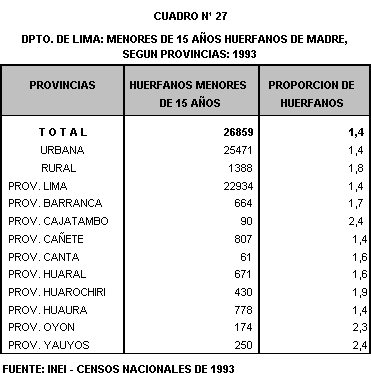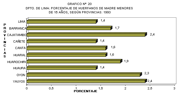 Considerando sólo a la población menor de 15 años de edad, se encuentra que la proporción de huérfanos de madre es de 1,4% para el departamento; dicha proporción es mayor para el área rural que para el área urbana (1,8% a 1,4% respectivamente). En las provincias de Lima, Cañete y Huaura la proporción es igual al promedio departamental. Por el contrario, en el resto de provincias los huérfanos menores de 15 años superan el promedio encontrado para el departamento, especialmente en las provincias de Cajatambo, Yauyos y Oyón.