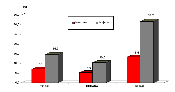 En el área urbana, la población de 15 a 19 años de edad registra una tasa de analfabetismo de sólo 2,8%; en el área rural , en cambio, la tasa es de 7,0% para dicho grupo de edad. En esta última área, el grupo de edad de 65 y más años, con 55,3% muestra la tasa de analfabetismo más alta.