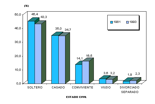 En el área urbana, se ha incrementado de manera importante la proporción de convivientes, de 12,0% en 1981 a 14,6% en 1993. Por otra parte, los solteros y viudos han decrecido en el último período intercensal. En el área rural, creció la proporción de convivientes y disminuyó la proporción de los casados y viudos.