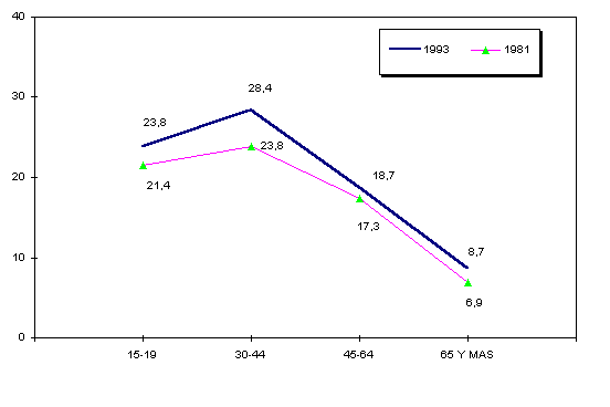 Por otro lado se observa que el grupo de edad de 15 a 29 años, la tasa de actividad se mantiene casi constante durante el período intercensal 1981-1993.