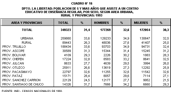 Los datos censales del departamento de La Libertad, muestran que existen 92,377 personas de 15 y más años de edad que nunca asistieron a la escuela. En el área rural el porcentaje más alto (60,3%) de personas que nunca asistieron a la escuela.