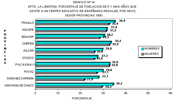 La asistencia escolar de los niños de 6 a 11 años es relativamente alta en la mayoría de las provincias, en Trujillo (91,2%), Ascope (91,0%) y Pacasmayo (90,6%) y baja en la provincia de Sánchez Carrión (69,3%) y Bolívar (76,4%). En el caso de los jóvenes de 12 a 17 años, la atención educativa cubre el 76,6% en el área urbana y 47,4% en la rural, donde la dispersión poblacional dificulta el acceso a los centros de educación secundaria que se ubica en la mayoría de las capitales distritales.