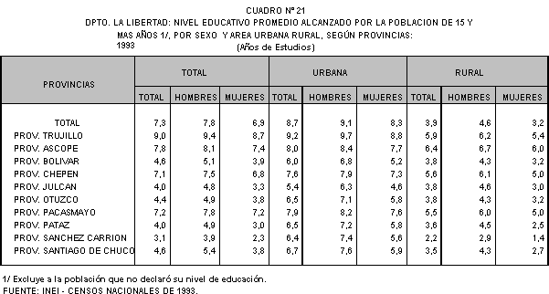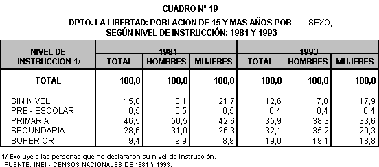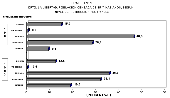 Los datos censales de 1993, están demostrando que el nivel educativo de la población de La Libertad ha experimentado un notable incremento respecto a 1981, al haber aumentado la población con educación secundaria y superior. En efecto, el 51,1% de la población de 15 y más años de edad ha logrado superar la educación primaria completa. En 1981 esta proporción fue de 38,0%. Con relación a la educación superior el 19,0% de la población ha alcanzado este nivel, mucho mayor al observado en 1981 que fue de 9,4%.