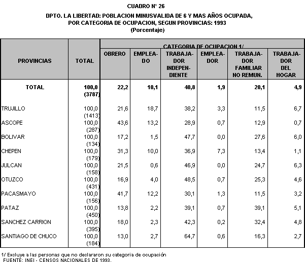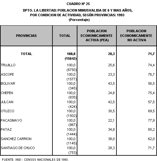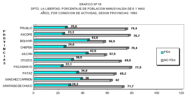 La población minusválida de 6 y más años según condición de actividad, muestra a nivel provincial un comportamiento similar al encontrado a nivel departamental; en todas las provincias es mayor la población económicamente no activa entre este grupo poblacional. Sin embargo en las provincias de Bolívar y Julcán la PEA minusválida de 6 y más años de edad, es de 43,5% y 42,5% respectivamente.
