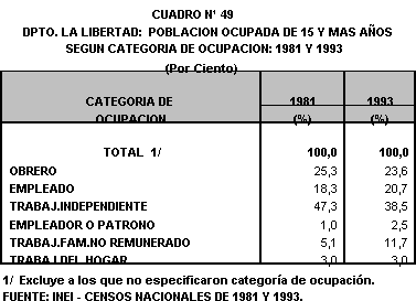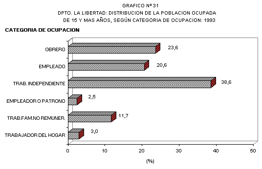 La PEA según categoría de ocupación en 1993, presenta cambios en su composición respecto a lo observado en 1981. Sin embargo, predomina la participación de los trabajadores independientes, cuya proporción en 1993 es de 38,6% de la población ocupada.