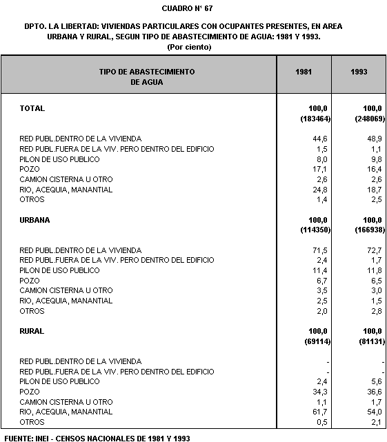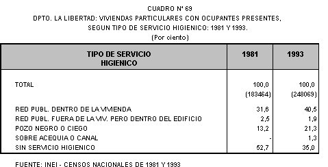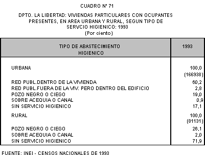 En 1993, en el área urbana el 60,2% de las viviendas particulares ocupadas tienen instalaciones de red pública dentro de la vivienda, el 19,0% utilizan pozo negro o ciego y un 17,1% no cuentan con servicio higiénico. En el área rural, el 26,1% de las viviendas utilizan pozo negro o ciego y el 2,0% acequias o canales. Un 71,9% no tienen servicio higiénico.