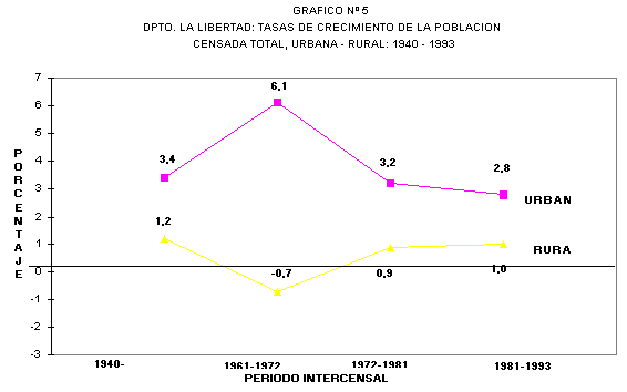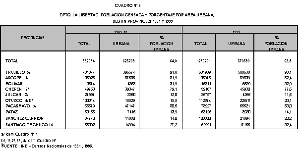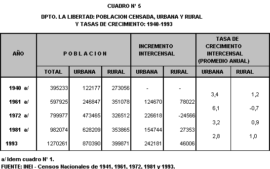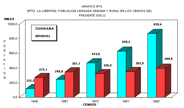 Las cifras muestran que en el departamento de La Libertad, la concentración poblacional en centros poblados urbanos se inicia a partir de 1972, representando el 59,2%. En 1981, dicho porcentaje se incrementó en 4,8 puntos porcentuales, alcanzando el 64,0%. En 1993,la población urbana representa 68,5% de la población.