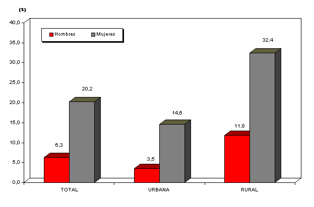 En el área urbana, la población de 15 a 19 años de edad registra una tasa de analfabetismo de sólo 1,8%. En el área rural, el grupo de edad de 65 y más años, con 55,2% muestra la tasa de analfabetismo más alta.