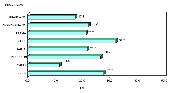 En el grupo con tasas de 13,0% a menos de 17,0%, se encuentran las provincias de Chanchamayo (15,2%) y Tarma (13,9%).