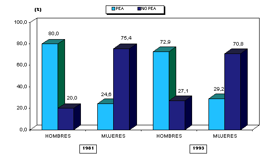 Por sexo, la población femenina disminuye su proporción dentro de la NO PEA, de 75,4% en 1981 a 70,8% en 1993, indicando una mayor participación de la mujer en las actividades económicas. La población masculina presenta un mayor incremento en su proporción dentro de la NO PEA. De 20,0% en 1981 a 27,1% en 1993.