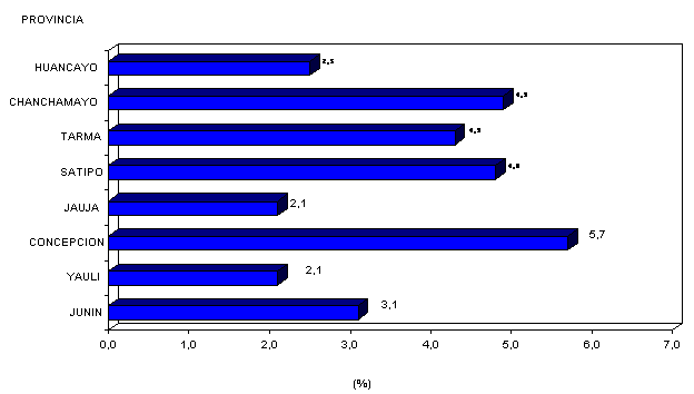 TOTAL HUANCAYO CHANCHAMAYO CONCEPCION JAUJA JUNIN SATIPO TARMA YAULI | 104161 28575 15606 25924 9504 24818 27860 15841 | 2623 1409 888 537 291 1196 1194 325 | 2,5 4,9 5,7 2,1 3,1 4,8 4,3 2,1 |