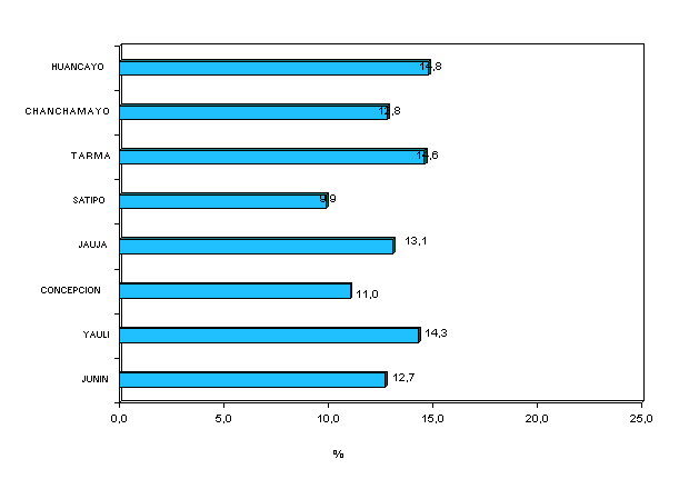 TOTAL HUANCAYO CHANCHAMAYO CONCEPCION JAUJA JUNIN SATIPO TARMA YAULI | 94556 24683 13973 23018 9045 19436 25387 15345 | 13962 3165 1539 3024 1153 1931 3715 2193 | 14,8 12,8 11,0 13,1 12,7 9,9 14,6 14,3 |